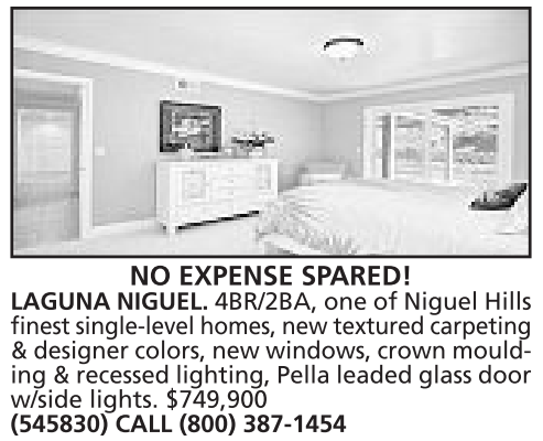 NO EXPENSE SPARED! LAGUNA NIGUEL. 4BR/2BA, one of Niguel Hills finest single-level homes, new textured carpeting &designer colors, new windows, crown moulding &recessed lighting, Pella leaded glass door w/side lights. $749,900 (545830) CALL (800) 387-1454