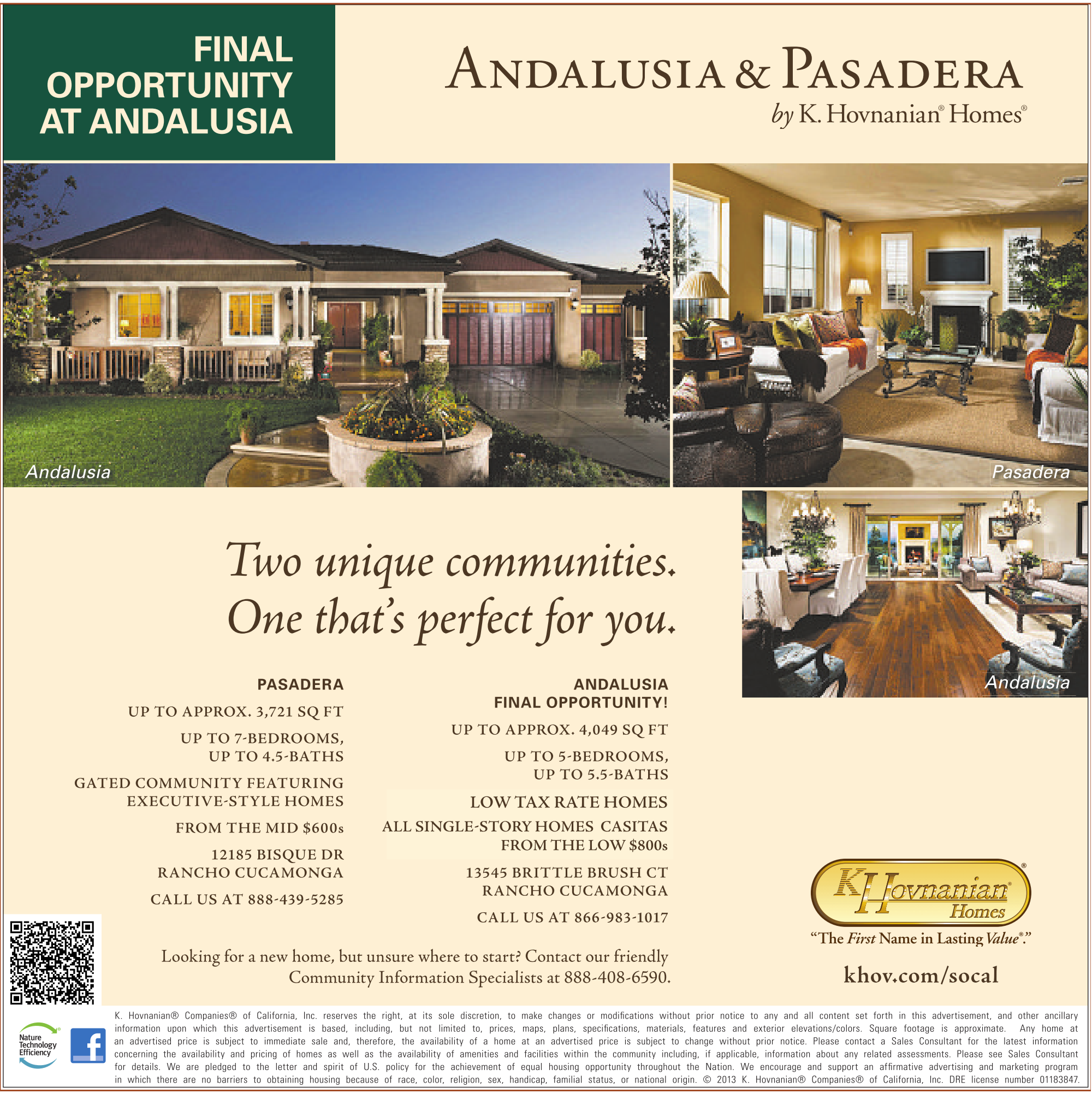 K. Hovnanian® Companies® of California, Inc. reserves the right, at its sole discretion, to make changes or modifications without prior notice to any and all content set forth in this advertisement, and other ancillary information upon which this advertisement is based, including, but not limited to, prices, maps, plans, specifications, materials, features and exterior elevations/colors. Square footage is approximate. Any home at an advertised price is subject to immediate sale and, therefore, the availability of a home at an advertised price is subject to change without prior notice. Please contact a Sales Consultant for the latest information concerning the availability and pricing of homes as well as the availability of amenities and facilities within the community including, if applicable, information about any related assessments. Please see Sales Consultant for details. We are pledged to the letter and spirit of U.S. policy for the achievement of equal housing opportunity throughout the Nation. We encourage and support an affirmative advertising and marketing program in which there are no barriers to obtaining housing because of race, color, religion, sex, handicap, familial status, or national origin. © 2013 K. Hovnanian® Companies® of California, Inc. DRE license number 01183847.
