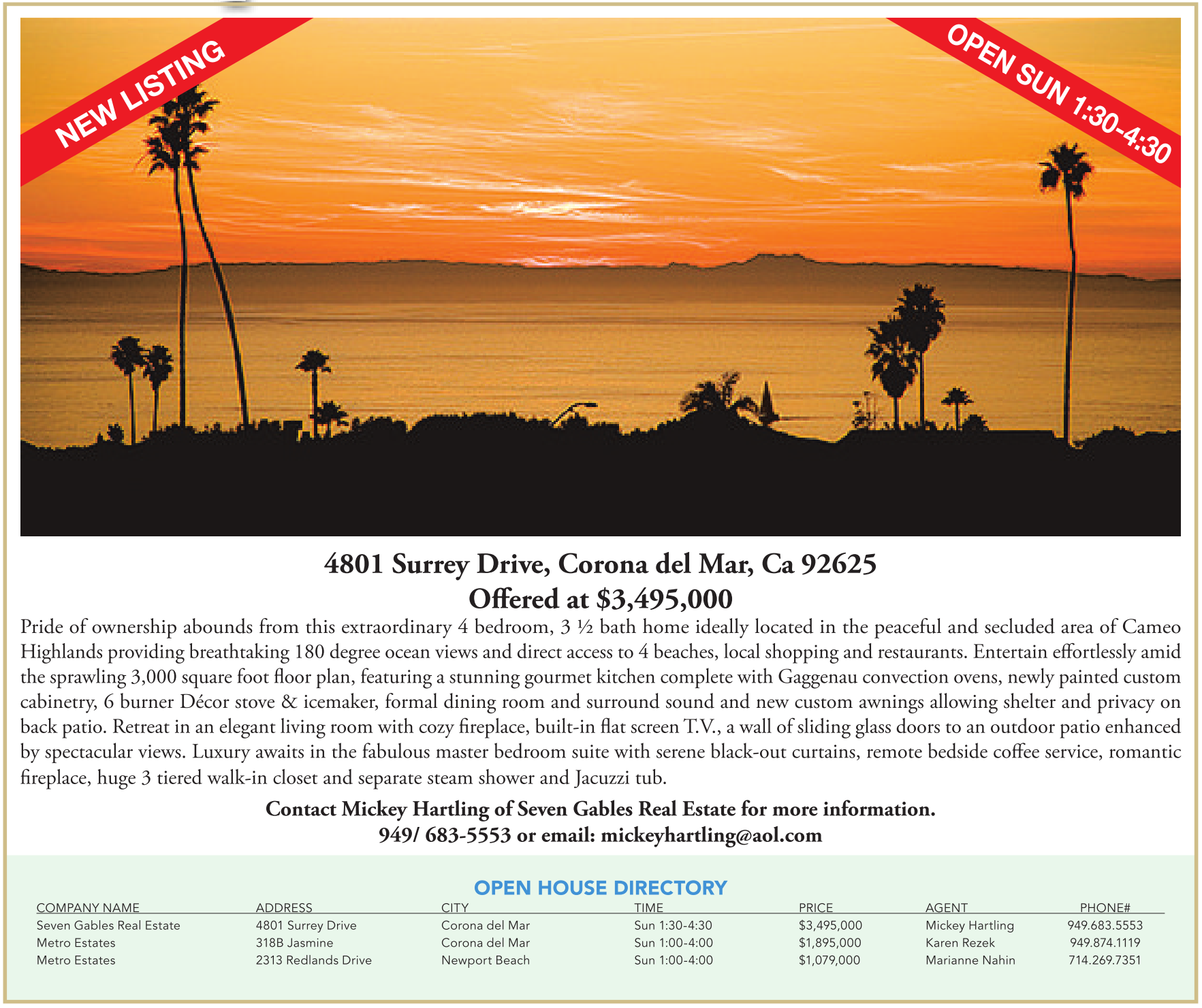 COMPANY NAME ADDRESS CITY TIME PRICE AGENT PHONE# Seven Gables Real Estate 4801 Surrey Drive Corona del Mar Sun 1:30-4:30 $3,495,000 Mickey Hartling 949.683.5553 Metro Estates 318B Jasmine Corona del Mar Sun 1:00-4:00 $1,895,000 Karen Rezek 949.874.1119 Metro Estates 2313 Redlands Drive Newport Beach Sun 1:00-4:00 $1,079,000 Marianne Nahin 714.269.7351