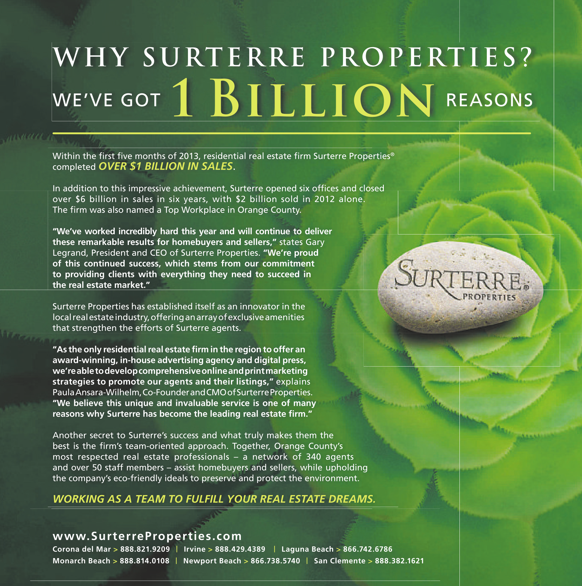 Another secret to Surterre’s success and what truly makes them the best is the firm’s team-oriented approach. Together, Orange County’s most respected real estate professionals – a network of 340 agents and over 50 staff members – assist homebuyers and sellers, while upholding the company’s eco-friendly ideals to preserve and protect the environment.