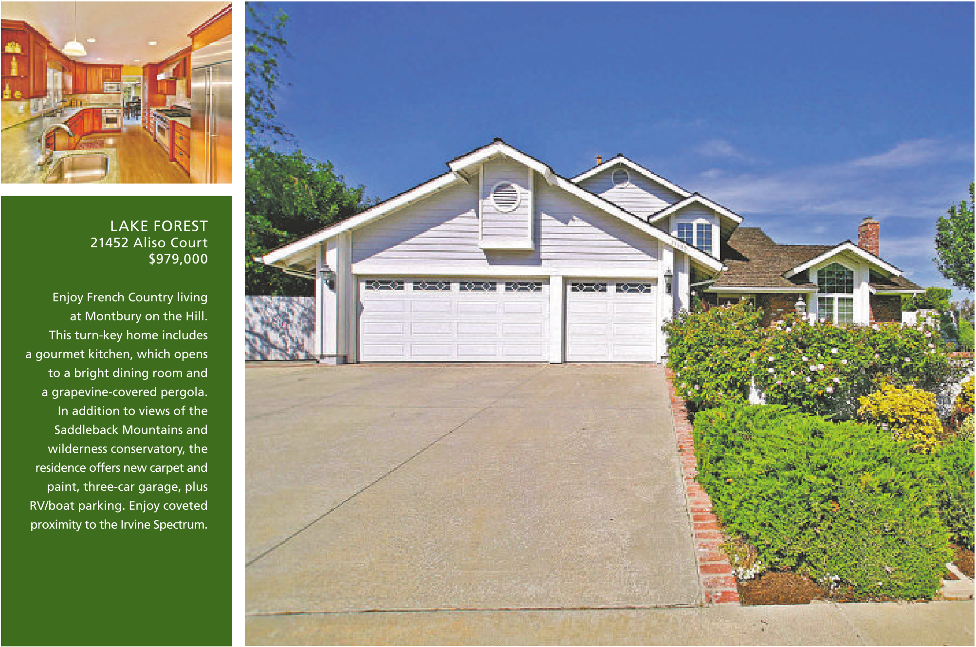 LAKE FOREST 21452 Aliso Court $979,000 Enjoy French Country living at Montbury on the Hill. This turn-key home includes a gourmet kitchen, which opens to a bright dining room and a grapevine-covered pergola. In addition to views of the Saddleback Mountains and wilderness conservatory, the residence offers new carpet and paint, three-car garage, plus RV/boat parking. Enjoy coveted proximity to the Irvine Spectrum.