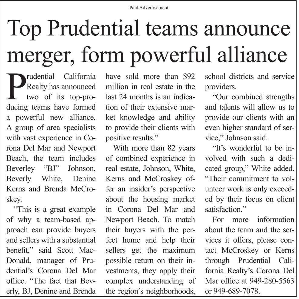 “This is a great example of why a team-based approach can provide buyers and sellers with asubstantial benefit,” said Scott Mac- Donald, manager of Prudential’s Corona Del Mar office. “The fact that Beverly, BJ, Denine and Brenda