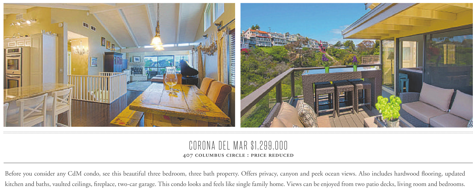 CORONA DEL MAR $1,299,000 407 columbus circle : price reduced Before you consider any CdM condo, see this beautiful three bedroom, three bath property. Offers privacy, canyon and peek ocean views. Also includes hardwood flooring, updated kitchen and baths, vaulted ceilings, fireplace, two-car garage. This condo looks and feels like single family home. Views can be enjoyed from two patio decks, living room and bedrooms.