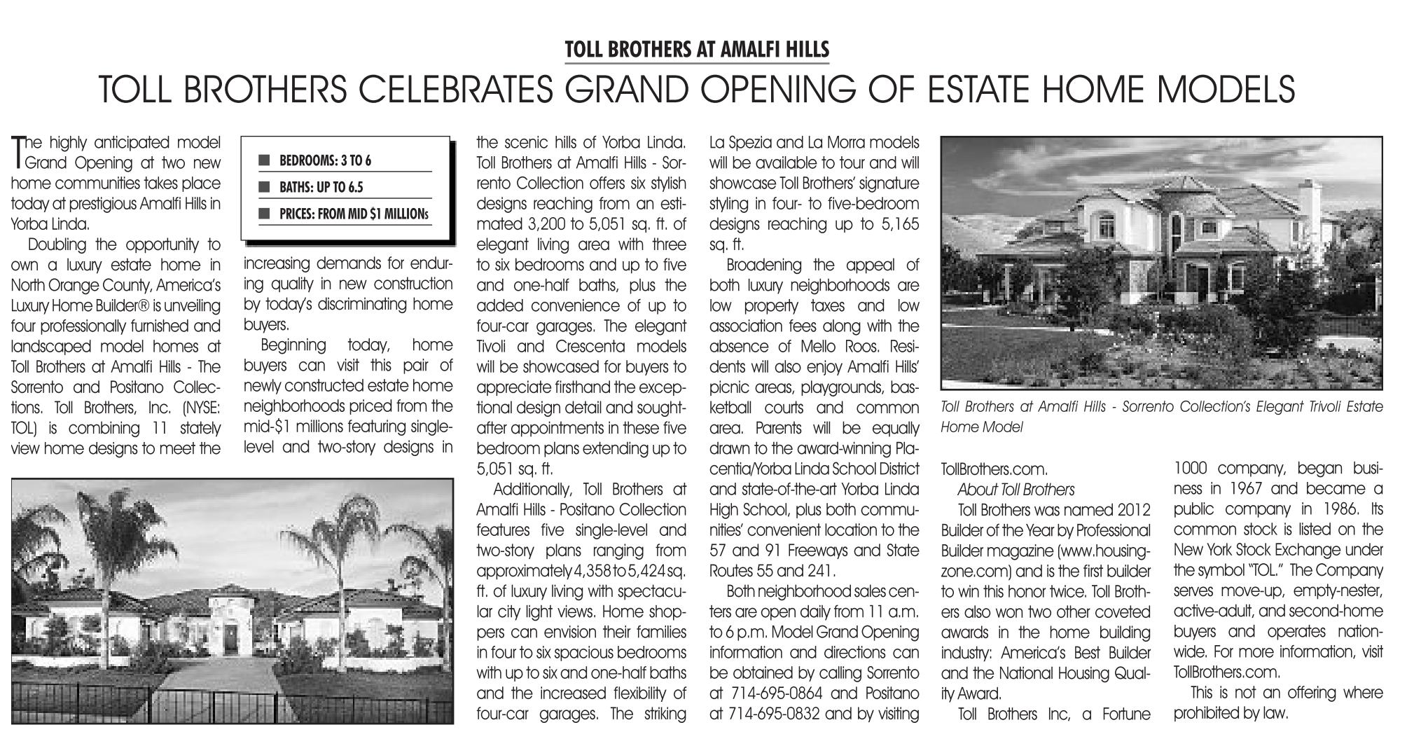 doubling the opportunity to own a luxury estate home in North Orange County, America’s luxury Home Builder® is unveiling four professionally furnished and landscaped model homes at Toll Brothers at Amalfi Hills - The sorrento and Positano Collections. Toll Brothers, inc. (NYsE: