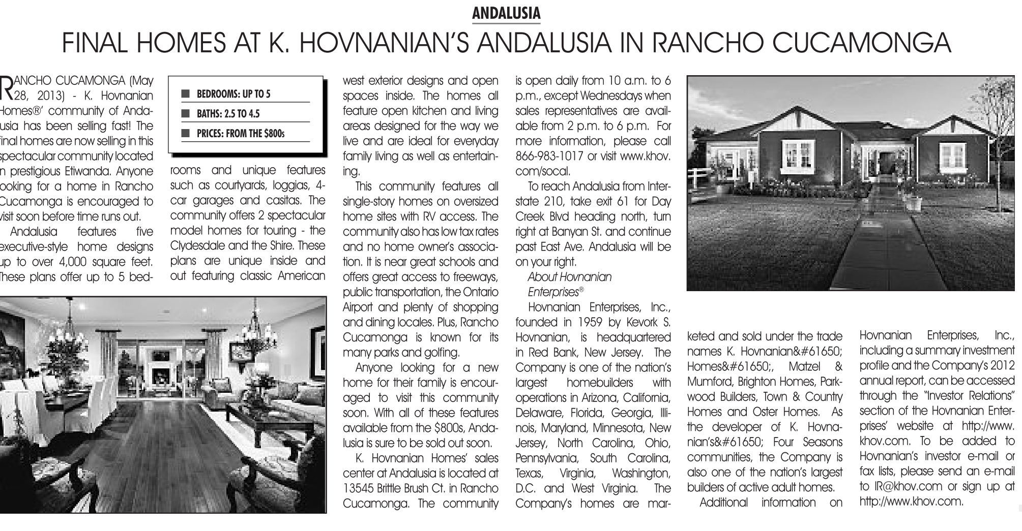 CUCAMONGA (May 28, 2013) - K. Hovnanian Homes®’ community of Andalusia has been selling fast! The final homes are now selling in this spectacular community located in prestigious Etiwanda. Anyone looking for a home in Rancho Cucamonga is encouraged to visit soon before time runs out.