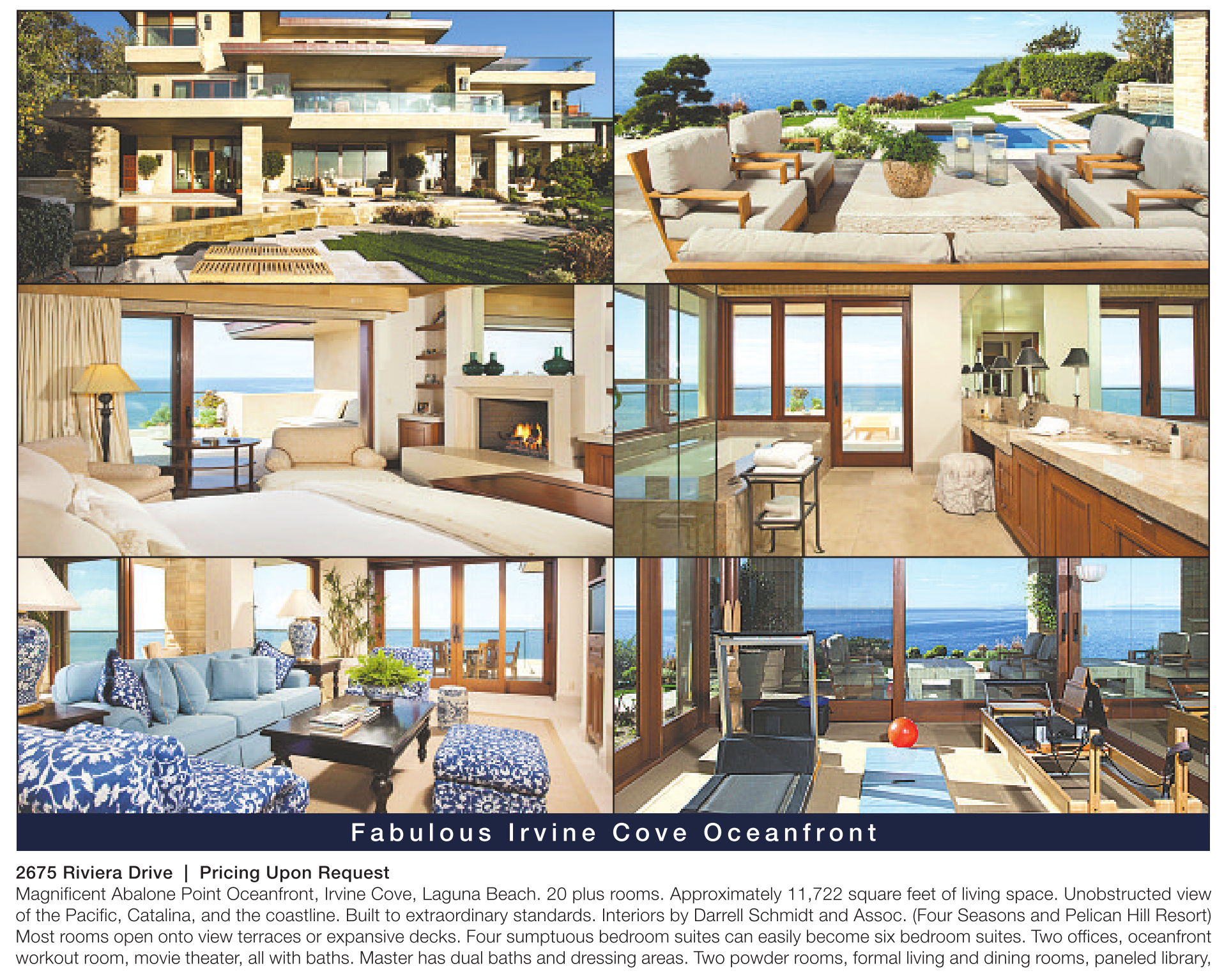 F a b u l o u s I r v i n e C o v e O c e a n f r o n t 2675 Riviera Drive | Pricing Upon Request Magnificent Abalone Point Oceanfront, Irvine Cove, Laguna Beach. 20 plus rooms. Approximately 11,722 square feet of living space. Unobstructed view of the Pacific, Catalina, and the coastline. Built to extraordinary standards. Interiors by Darrell Schmidt and Assoc. (Four Seasons and Pelican Hill Resort) Most rooms open onto view terraces or expansive decks. Four sumptuous bedroom suites can easily become six bedroom suites. Two offices, oceanfront workout room, movie theater, all with baths. Master has dual baths and dressing areas. Two powder rooms, formal living and dining rooms, paneled library,