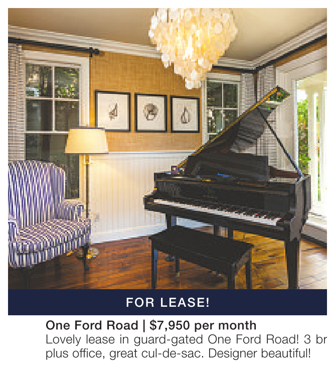 One Ford Road | $7,950 per month Lovely lease in guard-gated One Ford Road! 3 br plus office, great cul-de-sac. Designer beautiful!