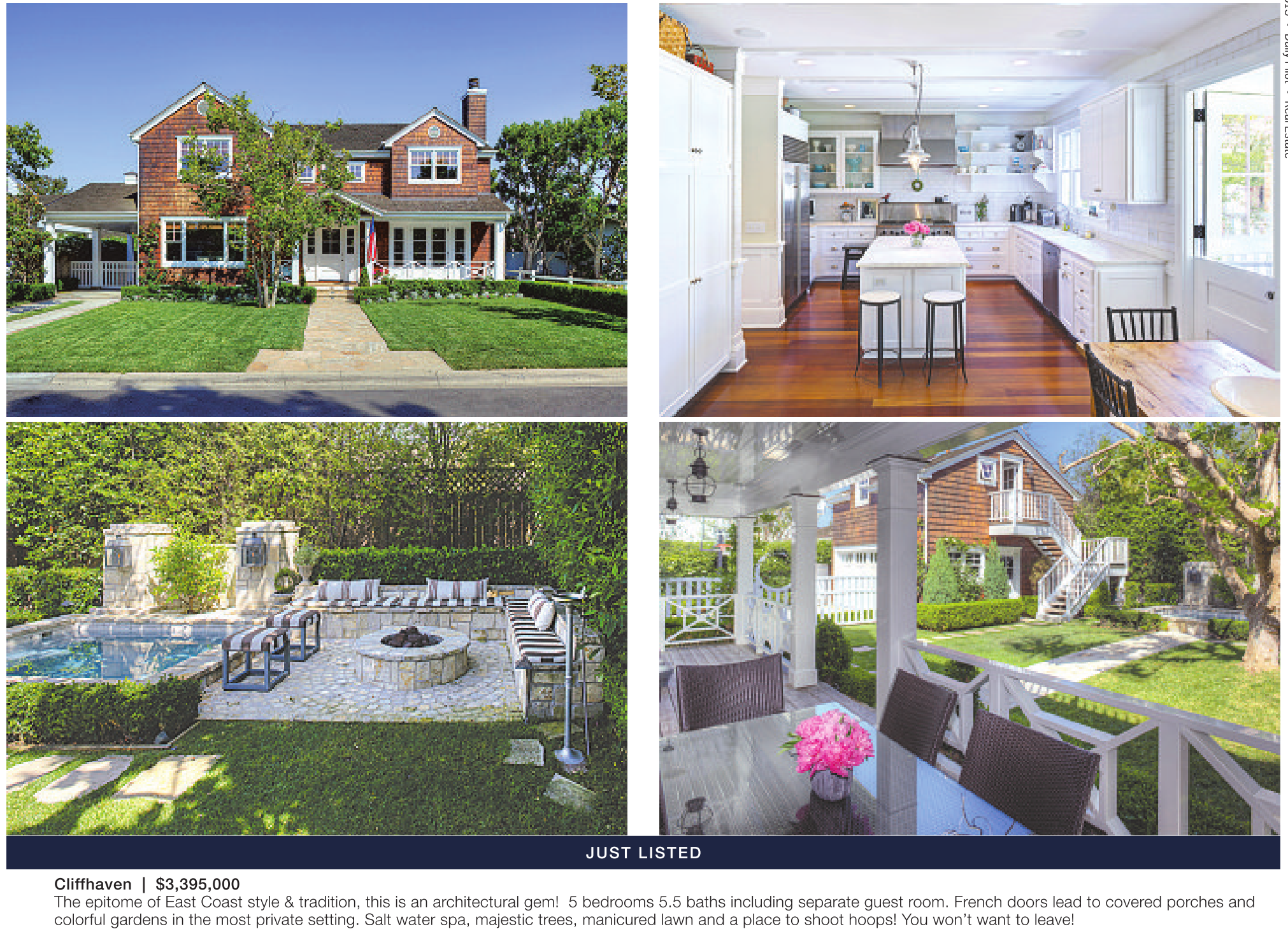 Cliffhaven | $3,395,000 The epitome of East Coast style & tradition, this is an architectural gem! 5 bedrooms 5.5 baths including separate guest room. French doors lead to covered porches and colorful gardens in the most private setting. Salt water spa, majestic trees, manicured lawn and a place to shoot hoops! You won’t want to leave!