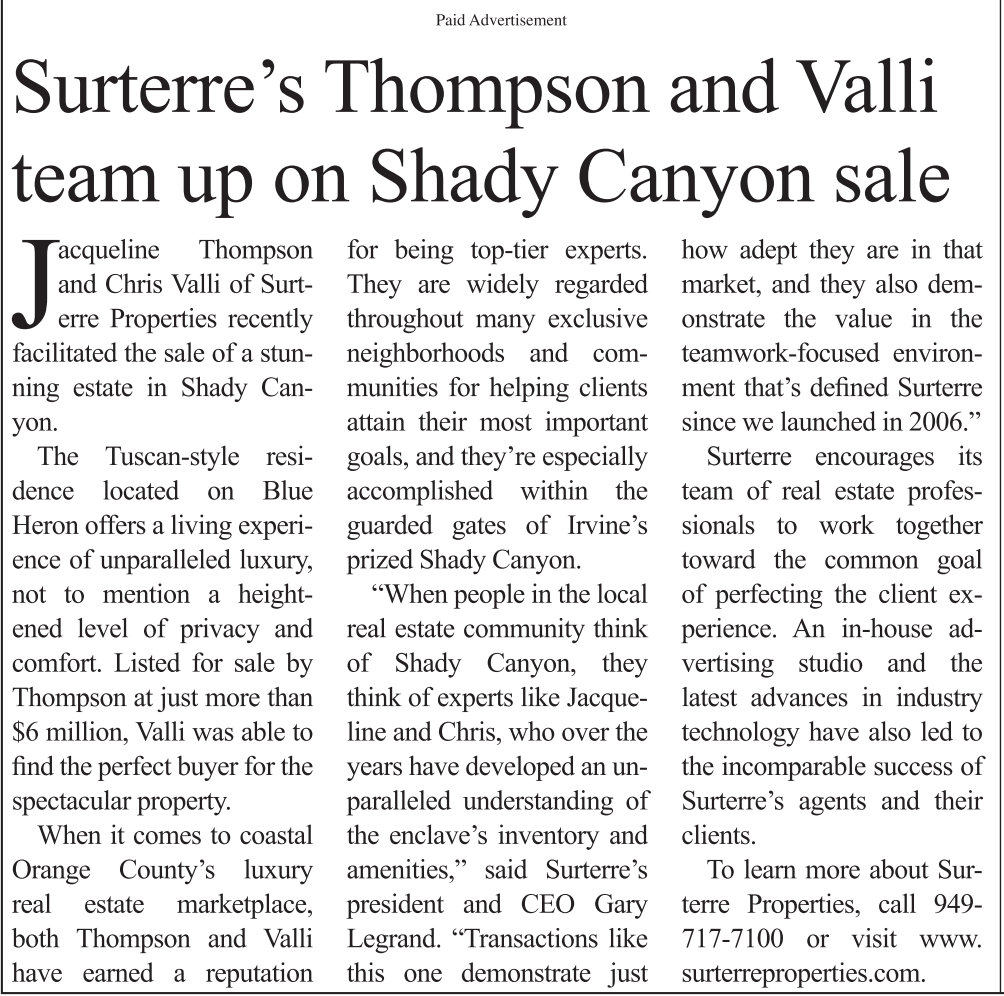 Thompson and Chris Valli of Surterre Properties recently facilitated the sale of a stunning estate in Shady Canyon.