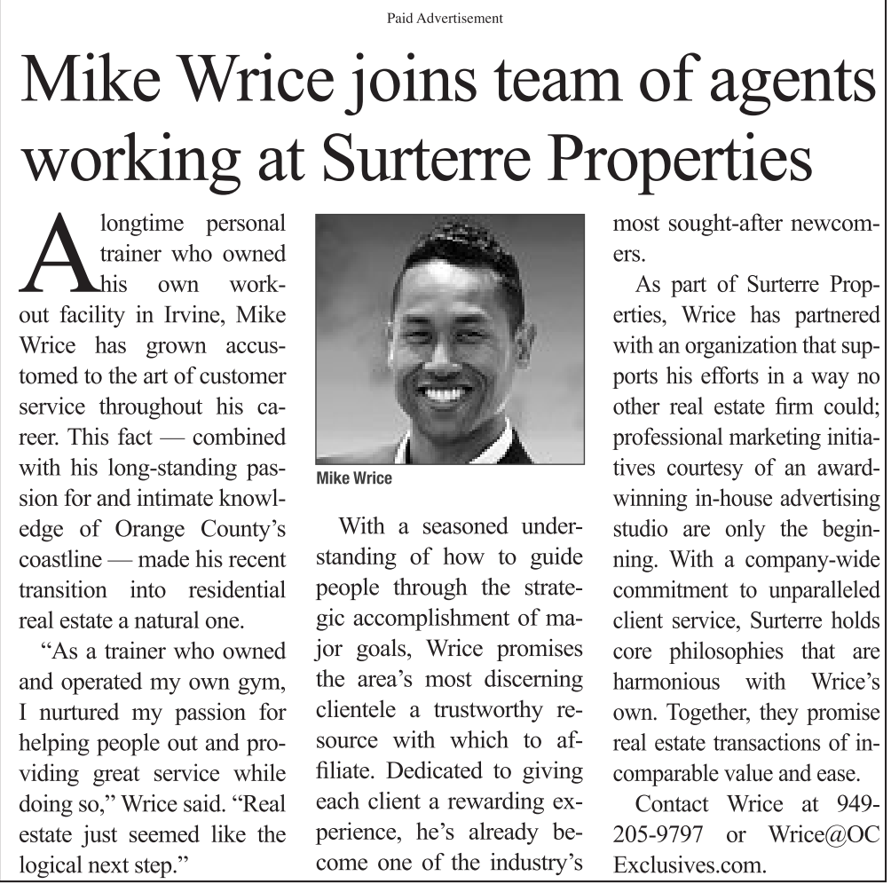 personal trainer who owned his own workout facility in Irvine, Mike Wrice has grown accustomed to the art of customer service throughout his career. This fact — combined with his long-standing passion for and intimate knowledge of Orange County’s coastline — made his recent transition into residential real estate a natural one.