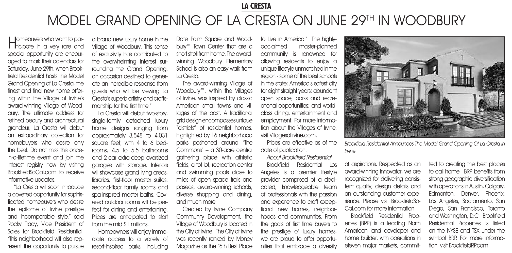 “La Cresta will soon introduce acoveted opportunity for sophisticated homebuyers who desire the epitome of Irvine prestige and incomparable style,” said Rocky Tracy, Vice President of Sales for Brookfield Residential. “This neighborhood will also represent the opportunity to pursue