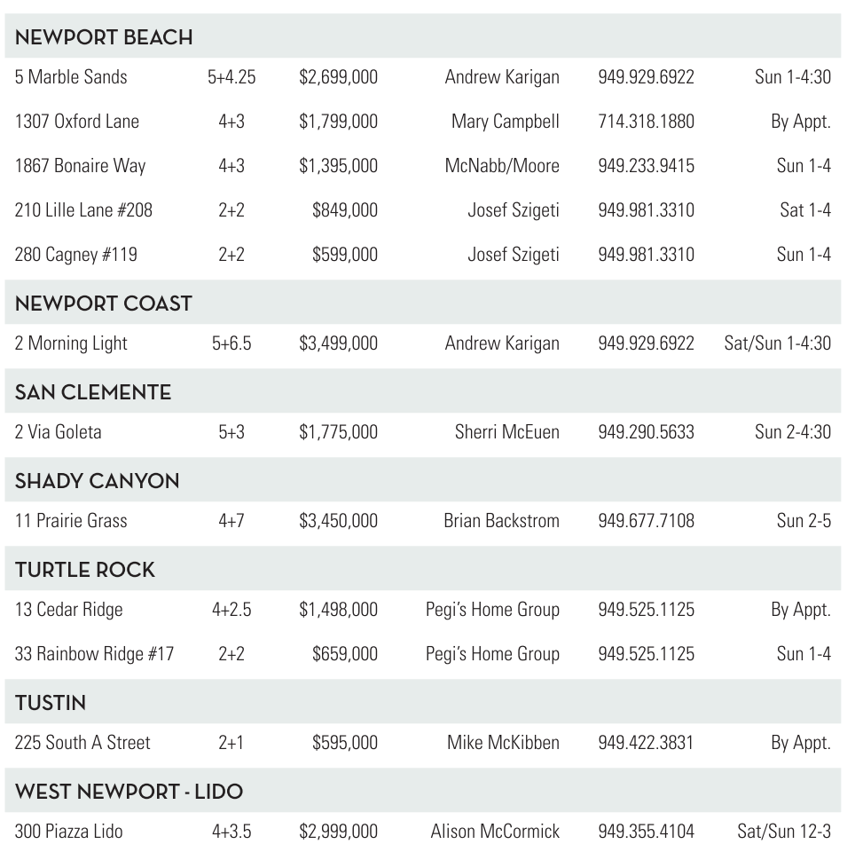 5Marble Sands 5+4.25 $2,699,000 Andrew Karigan 949.929.6922 Sun 1-4:30