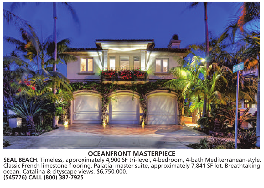 OCEANFRONT MASTERPIECE SEAL BEACH. Timeless, approximately 4,900 SF tri-level, 4-bedroom, 4-bath Mediterranean-style. Classic Frenchlimestone flooring. Palatial master suite, approximately 7,841 SF lot. Breathtaking ocean, Catalina & cityscape views. $6,750,000. (545776) CALL (800) 387-7925