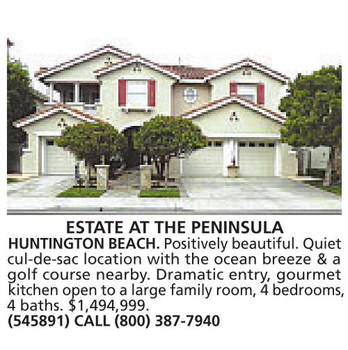 ESTATE AT THE PENINSULA HUNTINGTON BEACH. Positively beautiful. Quiet cul-de-sac location with the ocean breeze & a golf course nearby. Dramatic entry, gourmet kitchen open to alarge family room, 4bedrooms, 4 baths. $1,494,999. (545891) CALL (800) 387-7940