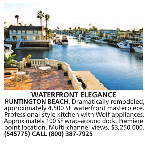 SF, estate. WATERFRONT ELEGANCE HUNTINGTON BEACH. Dramaticallyremodeled, approximately 4,500 SF waterfront masterpiece. Professional-style kitchenwith Wolf appliances. Approximately 100 SF wrap-around dock. Premiere point location. Multi-channel views. $3,250,000. (545775) CALL (800) 387-7925