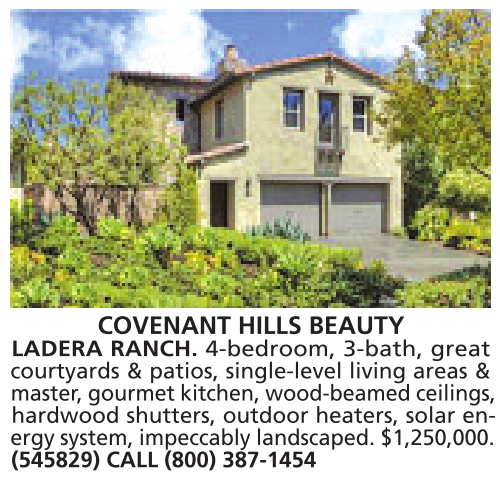 COVENANT HILLS BEAUTY LADERA RANCH. 4-bedroom, 3-bath, great courtyards & patios, single-level living areas & master,gourmet kitchen, wood-beamed ceilings, hardwood shutters, outdoor heaters, solar energy system, impeccably landscaped. $1,250,000. (545829) CALL (800) 387-1454