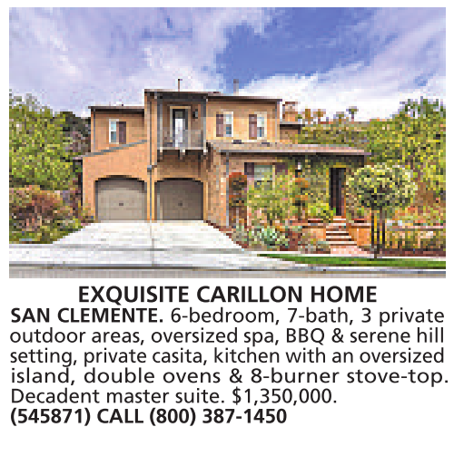 EXQUISITE CARILLON HOME SAN CLEMENTE. 6-bedroom, 7-bath, 3 private outdoor areas, oversized spa, BBQ &serene hill setting, private casita, kitchen with an oversized island, double ovens & 8-burner stove-top. Decadent master suite. $1,350,000. (545871) CALL (800) 387-1450