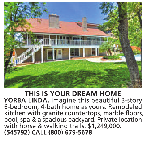 THIS IS YOUR DREAM HOME YORBA LINDA. Imagine this beautiful 3-story 6-bedroom, 4-bath home as yours. Remodeled kitchen with granite countertops, marble floors, pool, spa &aspacious backyard. Private location with horse & walking trails. $1,249,000. (545792) CALL (800) 679-5678