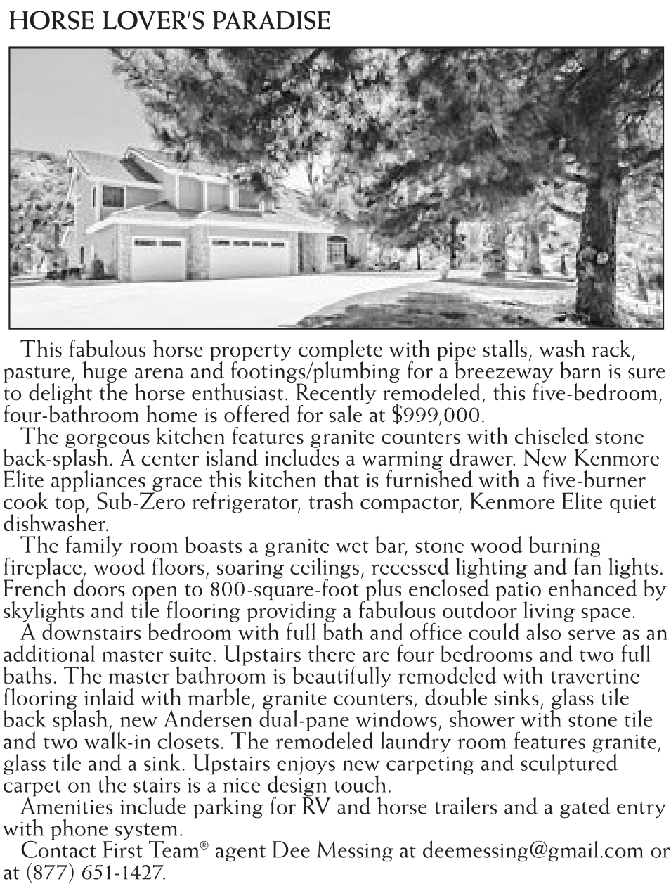 This fabulous horse property complete with pipe stalls, wash rack, pasture, huge arena and footings/plumbing for a breezeway barn is sure to delight the horse enthusiast. Recently remodeled, this five-bedroom, four-bathroom home is offered for sale at $999,000.