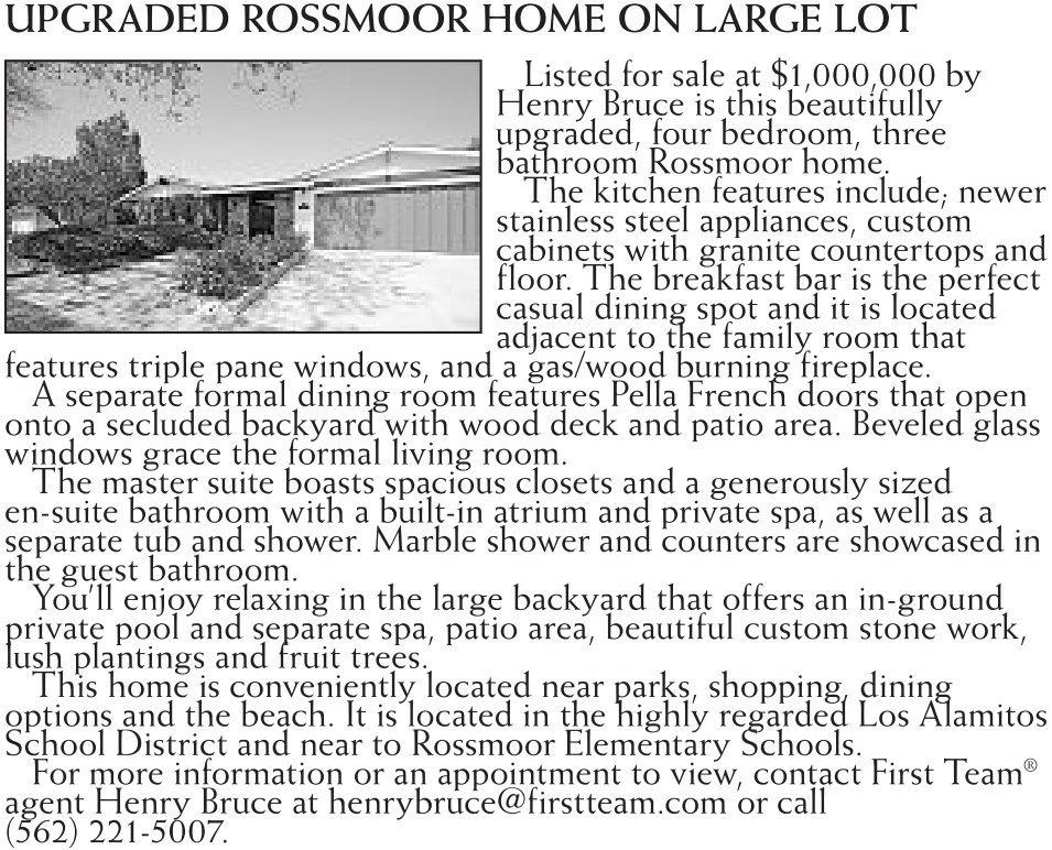 UPGRADED ROSSMOOR HOME ON LARGE LOT Listed for sale at $1,000,000 by Henry Bruce is this beautifully upgraded, four bedroom, three bathroom Rossmoor home. The kitchen features include; newer stainless steel appliances, custom cabinets with granite countertops and floor. The breakfast bar is the perfect casual dining spot and it is located adjacent to the family room that features triple pane windows, and a gas/wood burning fireplace. A separate formal dining room features Pella French doors that open onto a secluded backyard with wood deck and patio area. Beveled glass windows grace the formal living room. The master suite boasts spacious closets and a generously sized en-suite bathroom with a built-in atrium and private spa, as well as a separate tub and shower. Marble shower and counters are showcased in the guest bathroom. You’ll enjoy relaxing in the large backyard that offers an in-ground private pool and separate spa, patio area, beautiful custom stone work, lush plantings and fruit trees. This home is conveniently located near parks, shopping, dining options and the beach. It is located in the highly regarded Los Alamitos School District and near to Rossmoor Elementary Schools. For more information or an appointment to view, contact First Team ® agent Henry Bruce at henrybruce@firstteam.com or call (562) 221-5007.