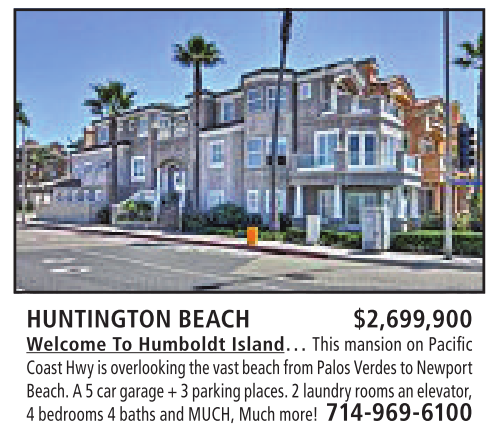HUNTINGTON BEACH $2,699,900 Welcome To Humboldt Island… This mansion onPacific CoastHwy is overlooking thevastbeachfrom PalosVerdes to Newport Beach.A5car garage+3parking places. 2laundry roomsanelevator, 4bedrooms 4baths andMUCH, Much more! 714-969-6100