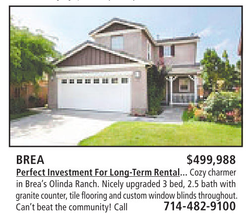 in Brea’s Olinda Ranch. Nicely upgraded 3bed, 2.5 bath with granite counter,tileflooring andcustom window blinds throughout. Can’tbeat thecommunity!Call 714-482-9100