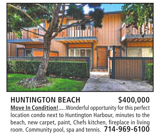 location condo next toHuntington Harbour, minutes tothe beach, new carpet, paint, Chefs kitchen, fireplace inliving room. Communitypool, spaand tennis. 714-969-6100