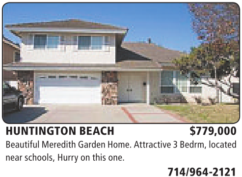 HUNTINGTON BEACH $779,000 BeautifulMeredith Garden Home.Attractive3Bedrm, located near schools,Hurry on this one.