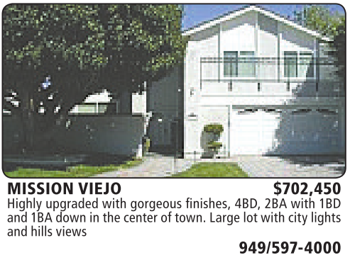MISSION VIEJO $702,450 Highly upgraded with gorgeous finishes, 4BD, 2BA with 1BD and1BA down in thecenteroftown. Largelot with citylights andhillsviews 949/597-4000