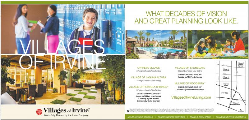 8 VILLAGES OF IRVINE ® WHAT DECADES OF VISION AND GREAT PLANNING LOOK LIKE. CYPRESS VILLAGE 3 Neighborhoods Now Selling VILLAGE OF STONEGATE 6 Neighborhoods Now Selling Village of Stonegate 133 Village of Portola Springs VILLAGE OF LAGUNA ALTURA 2 Neighborhoods Now Selling VILLAGE OF PORTOLA SPRINGS ® 3 Neighborhoods Now Selling GRAND OPENING JUNE 29 TH Agave by William Lyon Homes Colibri by Ryland Homes Quinterra by Taylor Morrison GRAND OPENING JUNE 29 TH Arcadia by TRI Pointe Homes VILLAGE OF WOODBURY ™GRAND OPENING JUNE 29 TH La Cresta by Brookfield Residential VillagesofIrvineLiving.com 73 Village of Woodbury Trabuco Rd. Cypress Village IRVINE 5133 405 Village of Laguna Altura Villages of Irvine®, Portola Springs® and Woodbury™ are registered trademarks of The Irvine Company LLC, used for marketing villages of new homes in Irvine, California USA.©2013 The Irvine Company LLC. All Rights Reserved. Plan, pricing, and product information subject to change. All projects are in planned communities developed by Irvine Community Development Company LLC, an affiliate of The Irvine Company LLC. “Masterfully Planned by The Irvine Company” means that the Irvine Company created the master land plan for all Irvine Company communities. The “master land plan” includes the overall entitlement and design of each community but does not include the design, construction and sale of homes. The design, construction and sale of homes is the sole responsibility of community builders. The Irvine Company is not designing, constructing or offering homes for sale in any community.Models do not reflect racial preference. AWARD-WINNING SCHOOLS | RESORT-INSPIRED AMENITIES | TRAILS & OPEN SPACE | CONVENIENT IRVINE LOCATIONS