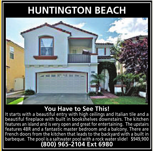 HUNTINGTON BEACH You Have to See This! It starts with abeautiful entry with high ceilings and Italian tile and abeautiful fireplace with built in bookshelves downstairs. The kitchen features an island andisveryopenand greatfor entertaining. Theupstairs features 4BR and afantastic master bedroom and abalcony. There are French doors from the kitchen that leads to the backyard with abuilt in barbeque. The pool is asaltwater pool witharockwater slide! $949,900 (800) 965-2104 Ext 6980