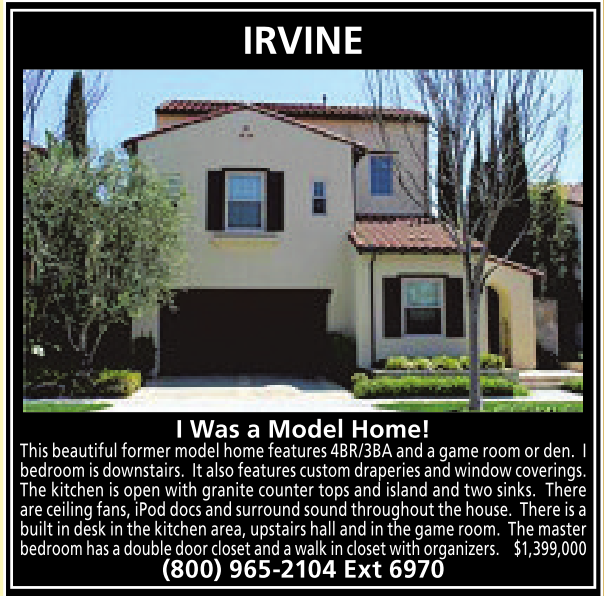 IRVINE I Was a Model Home! This beautifulformer modelhomefeatures4BR/3BA andagameroomorden. Ibedroom is downstairs. It also features custom draperiesand windowcoverings. The kitchen is open with granite counter tops and island and two sinks. There areceiling fans,iPoddocsand surroundsoundthroughoutthe house. Thereisa builtindeskinthe kitchen area,upstairshalland in thegameroom. Themaster bedroom hasadouble door closet andawalk in closet withorganizers. $1,399,000 (800) 965-2104 Ext 6970