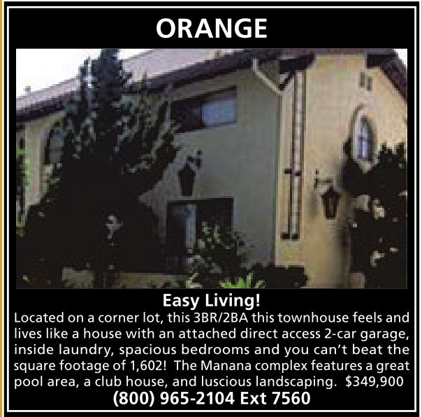ORANGE Easy Living! Locatedonacorner lot, this 3BR/2BAthistownhousefeels and lives like ahouse with anattached direct access 2-car garage, inside laundry, spacious bedrooms and you can’t beat the squarefootage of 1,602! TheMananacomplex features agreat pool area, aclub house, and luscious landscaping. $349,900 (800) 965-2104 Ext 7560 See also