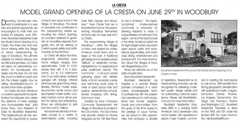 homebuyers who want to participate in a very rare and special opportunity are encouraged to mark their calendars for Saturday, June 29th, when Brookfield Residential hosts the Model Grand Opening of La Cresta, the finest and final new home offering within the Village of Irvine’s award-winning Village of Woodbury. The ultimate address for refined beauty and architectural grandeur, La Cresta will debut an extraordinary collection for homebuyers who desire only the best. Do not miss this once-in-a-lifetime event and join the interest registry now by visiting BrookfieldSoCal.com to receive informative updates.