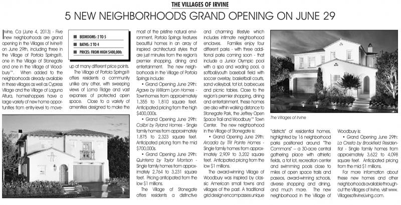 Ca (June 4, 2013) - Five new neighborhoods are grand opening in the Villages of Irvine® on June 29th, including three in the Village of Portola Springs®, one in the Village of Stonegate and one in the Village of woodbury™. when added to the neighborhoods already available in these villages as well as Cypress Village and the Village of laguna altura, homeshoppers have a large variety of new home opportunities from entry-level to move-