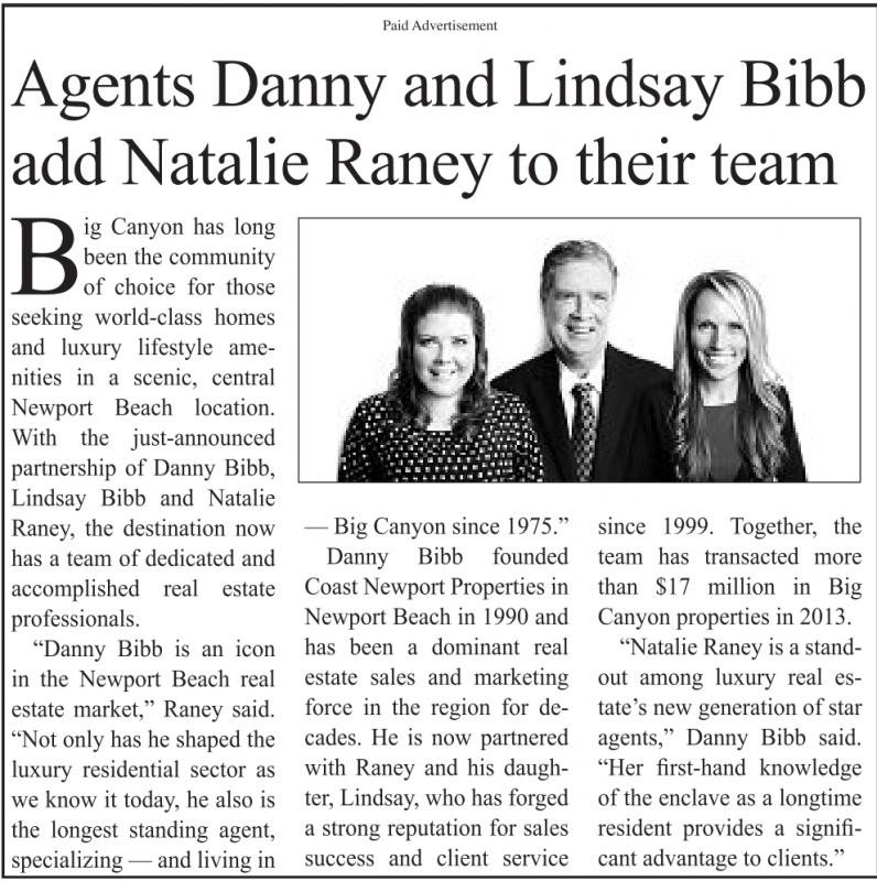 Danny Bibb founded Coast Newport Properties in Newport Beach in 1990 and has been a dominant real estate sales and marketing force in the region for decades. He is now partnered with Raney and his daughter, Lindsay, who has forged a strong reputation for sales success and client service