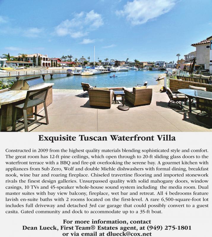 Exquisite Tuscan Waterfront Villa Constructed in 2009 from the highest quality materials blending sophisticated style and comfort. The great room has 12-ft pine ceilings, which open through to 20-ft sliding glass doors to the waterfront terrace with a BBQ and fire-pit overlooking the serene bay. A gourmet kitchen with appliances from Sub Zero, Wolf and double Miehle dishwashers with formal dining, breakfast nook, wine bar and roaring fireplace. Chiseled travertine flooring and imported stonework rivals the finest design galleries. Unsurpassed quality with solid mahogany doors, window casings, 10 TVs and 45-speaker whole-house sound system including the media room. Dual master suites with bay view balcony, fireplace, wet bar and retreat. All 4 bedrooms feature lavish en-suite baths with 2 rooms located on the first-level. A rare 6,500-square-foot lot includes full driveway and detached 3rd car garage that could possibly convert to a guest casita. Gated community and dock to accommodate up to a 35-ft boat. For more information, contact Dean Lueck, First Team® Estates agent, at (949) 275-1801 or via email at dlueck@cox.net