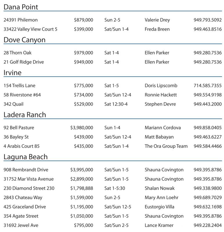 Dana Point 24391Philemon $879,000 Sun 2-5 Valerie Drey 949.793.5092 33422 Valley View Court5 $399,000 Sat/Sun 1-4 Freda Breen 949.463.8516 Dove Canyon 28 Thorn Oak $979,000 Sat 1-4 Ellen Parker 949.280.7536 21 Golf Ridge Drive $949,000 Sat 1-4 Ellen Parker 949.280.7536 Irvine 154 Trellis Lane $775,000 Sat 1-5 Doris Lipscomb 714.585.7355 58 Riverstone #64 $734,000 Sat/Sun 12-4 Ronnie Hackett 949.554.9198 342 Quail $529,000 Sat 12:30-4 Stephen Devre 949.443.2000 Ladera Ranch 92 Bell Pasture $3,980,000 Sun 1-4 Mariann Cordova 949.858.0405 36 Bayley St $439,000 Sat/Sun 12-4 Matt Babayan 949.463.6227 4Arabis Court85 $435,000 Sat/Sun 1-4 TheOra Group Team 949.584.4466 Laguna Beach 908 Rembrandt Drive $3,995,000 Sat/Sun 1-5 Shauna Covington 949.395.8786 31752 MarVista Avenue $2,899,000 Sat/Sun 1-5 Shauna Covington 949.395.8786 230 Diamond Street 230 $1,798,888 Sat 1-5:30 Shalan Nowak 949.338.9800 2843 Chateau Way $1,599,000 Sun 2-5 Mary Ann Loehr 949.689.7029 425 Graceland Drive $1,195,000 Sat/Sun 12-5 EustorgioVilla 949.632.1698 354 AgateStreet $1,050,000 Sat/Sun 1-5 Shauna Covington 949.395.8786 31692 Jewel Ave $795,000 Sat/Sun 2-5 LanceKramer 949.228.2404