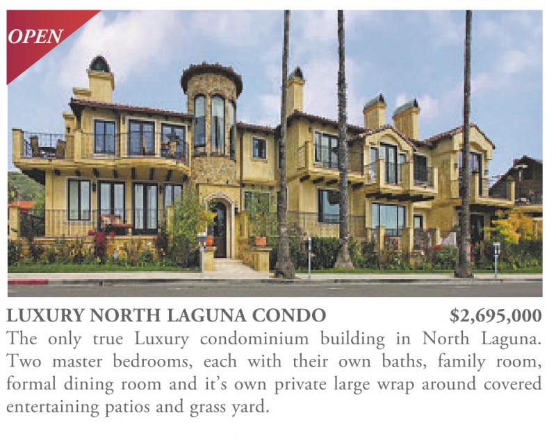 LUXURY NORTH LAGUNA CONDO $2,695,000 The only true Luxury condominium building in North Laguna. Two master bedrooms, each with their own baths, family room, formal dining room and it’s own private large wrap around covered entertaining patios and grass yard.