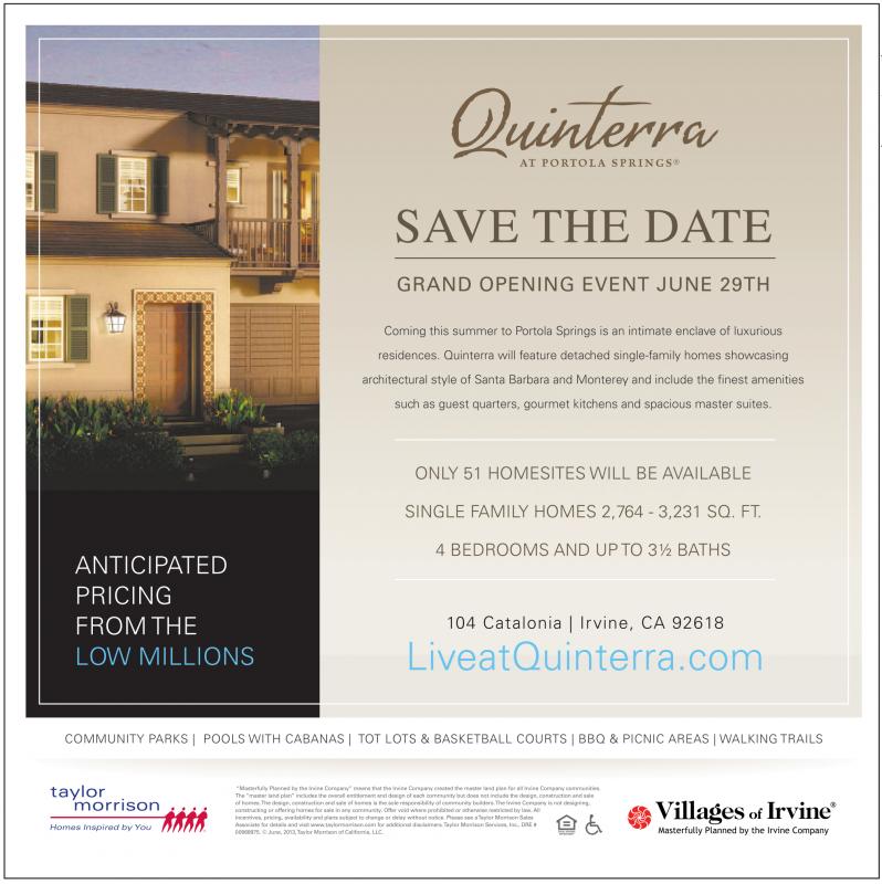 SAVE THE DATE GRAND OPENING EVENT JUNE 29TH Coming this summer to Portola Springs is an intimate enclave of luxurious residences. Quinterra will feature detached single-family homes showcasing architectural style of Santa Barbara and Monterey and include the finest amenities such as guest quarters, gourmet kitchens and spacious master suites. ONLY 51 HOMESITES WILL BE AVAILABLE SINGLE FAMILY HOMES 2,764 - 3,231 SQ. FT. ANTICIPATED PRICING FROM THE LOW MILLIONS 4 BEDROOMS AND UP TO 3½ BATHS 104 Catalonia | Irvine, CA 92618 LiveatQuinterra.com COMMUNITY PARKS | POOLS WITH CABANAS | TOT LOTS & BASKETBALL COURTS | BBQ & PICNIC AREAS | WALKING TRAILS “Masterfully Planned by the Irvine Company” means that the Irvine Company created the master land plan for all Irvine Company communities. The “master land plan” includes the overall entitlement and design of each community but does not include the design, construction and sale of homes.The design, construction and sale of homes is the sole responsibility of community builders.The Irvine Company isnot designing, constructing or offering homes for sale in any community. Offer void where prohibited or otherwise restricted by law.All incentives, pricing, availability and plans subject to change or delay without notice. Please see aTaylor Morrison Sales Associate for details and visit www.taylormorrison.com for additional disclaimers.Taylor Morrison Services, Inc., DRE # 00968975. ©June, 2013,Taylor Morrison of California, LLC.