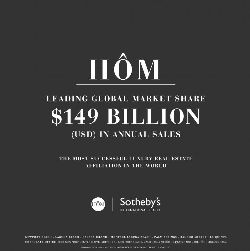 H Ô M L E A D I N G G L O B A L M A R K E T S H A R E $14 9 B I LLI O N (USD) IN ANNUAL SALES THE MOST SUCCESSFUL LUXURY REAL ESTATE AFFILIATION IN THE WORLD newport beach . laguna beach . balboa island . montage laguna beach . palm springs . rancho mirage . la quinta corporate office 1200 newport center drive, suite 100 . newport beach, california 92660 . 949.554.1200 . info@homgroup.com information obtained from sotheby’s international realty, from 2012