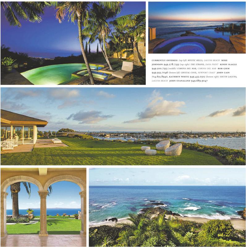 currently offered: (top left) MYSTIC HILLS, LAGUNA BEACH mike johnson 949.278.7333 (top right) THE STRAND, DANA POINT kindy slagle 949.500.7353 (middle) CORONA DEL MAR, CORONA DEL MAR rob giem 949.933.7046 (bottom left) CRYSTAL COVE, NEWPORT COAST john cain 714.655.8940, kathryn white 949.433.0315 (bottom right) SOUTH LAGUNA, LAGUNA BEACH john stanaland 949.689.9047