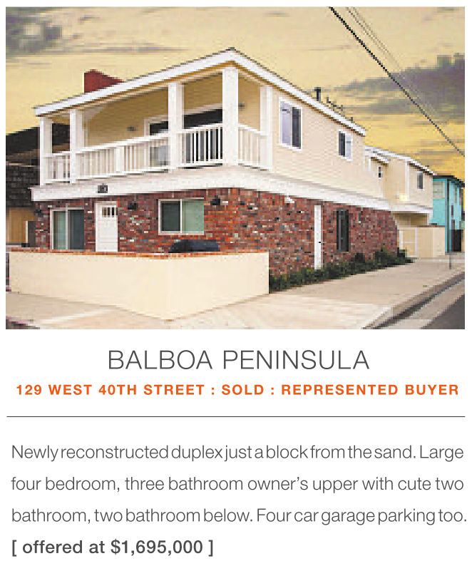 BALBOA PENINSULA 129 WEST 40TH STREET : SOLD : REPRESENTED BUYER Newlyreconstructedduplexjustablockfromthesand.Large four bedroom,three bathroom owner’supper with cute two bathroom,two bathroom below. Four cargarageparking too. [ offered at $1,695,000 ] See also