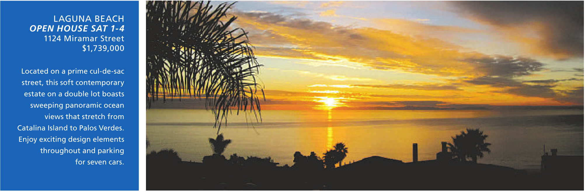 LAGUNA BEACH OPEN HOUSE SAT 1-4 1124 Miramar Street $1,739,000 Located on a prime cul-de-sac street, this soft contemporary estate on a double lot boasts sweeping panoramic ocean views that stretch from Catalina Island to Palos Verdes. Enjoy exciting design elements throughout and parking for seven cars.