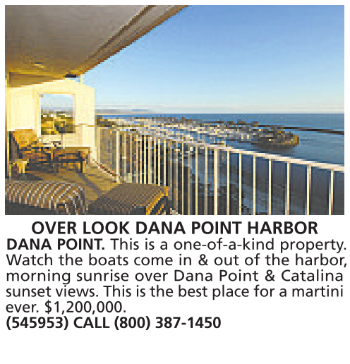 OVER LOOK DANA POINT HARBOR DANA POINT. This is a one-of-a-kind property. Watch the boats come in & out of the harbor, morning sunrise over Dana Point & Catalina sunset views. This is the best place for amartini ever. $1,200,000. (545953) CALL (800) 387-1450