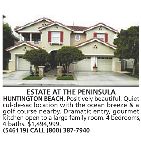ESTATE AT THE PENINSULA HUNTINGTON BEACH. Positively beautiful. Quiet cul-de-sac location with the ocean breeze & a golf course nearby. Dramatic entry, gourmet kitchen open to alarge family room. 4bedrooms, 4 baths. $1,494,999. (546119) CALL (800) 387-7940