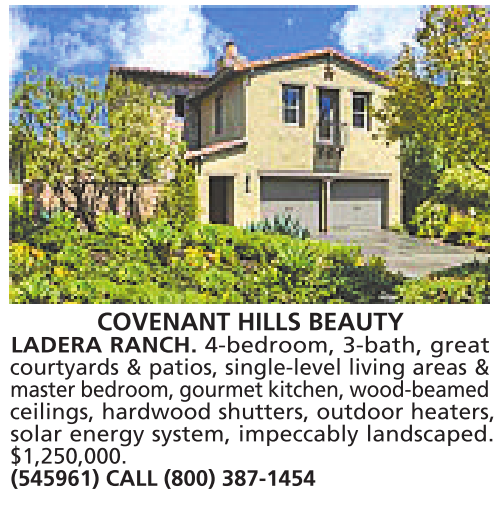 COVENANT HILLS BEAUTY LADERA RANCH. 4-bedroom, 3-bath, great courtyards & patios, single-level living areas & master bedroom, gourmet kitchen, wood-beamed ceilings, hardwood shutters, outdoor heaters, solar energy system, impeccably landscaped. $1,250,000. (545961) CALL (800) 387-1454