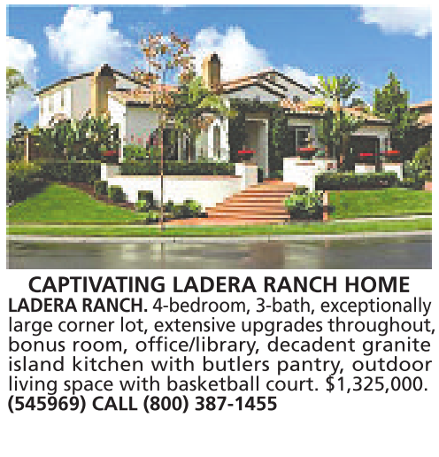 CAPTIVATING LADERA RANCH HOME LADERA RANCH. 4-bedroom, 3-bath, exceptionally large corner lot, extensive upgrades throughout, bonus room, office/library, decadent granite island kitchen with butlers pantry, outdoor living space with basketball court. $1,325,000. (545969) CALL (800) 387-1455