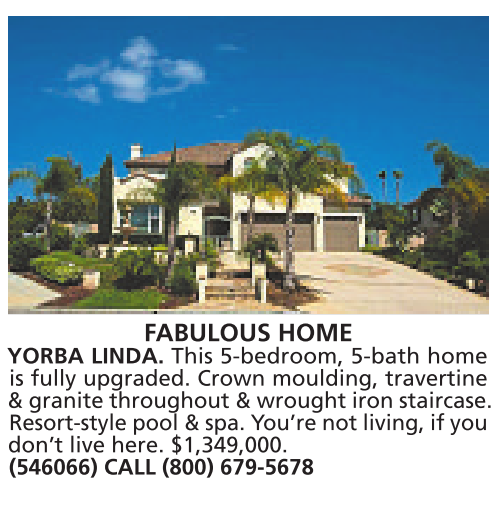 FABULOUS HOME YORBA LINDA. This 5-bedroom, 5-bath home is fully upgraded. Crown moulding, travertine &granite throughout &wrought iron staircase. Resort-style pool &spa. You’re not living, if you don’t live here. $1,349,000. (546066) CALL (800) 679-5678