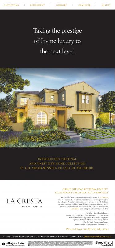 CAPTIVATING | REFINEMENT | COMFORT | GRANDEUR | BEAUTY Taking the prestige of Irvine luxury to the next level. I N T RO D U C I N G T H E F I N A L A N D F I N E ST N E W H O M E C O L L E C T I O N I N T H E AWA R D -W I N N I N G V I L L AG E O F WO O D B U RY. GRAND OPENING SATURDAY, JUNE 29 TH SALES PRIORITY REGISTRATION IN PROGRESS The ultimate Irvine address will soon make its debut, as LA CRESTA prepares to unveil the most luxurious and final new home opportunity in the Village of Woodbury. Discerning buyers who aspire to only the finest architectural design will find this collection the epitome of grace, beauty and status. We believe your home should take you to the next level and LA CRESTA is superbly poised to enrich your lifestyle. Two-StorySingle-Family Homes Approx. 3,622 -4,098 Sq. Ft. •4-6Bedrooms •Upto5.5 Baths Covered Outdoor Living Spaces •First Floor Living Suites Spacious Bedrooms •Second Floor Family Retreats 2-Car Oversized Garages with Storage Located in the Prestigious Village of Woodbury ™ Priced From the Mid $1 Millions Secure Your Position on the Sales Priority Registry Today. Visit BrookfieldSoCal.com Copyright ©2013 Brookfield Residential. All Rights Reserved. Plan, pricing and product information subject to change at the sole discretion of Brookfield Residential. Woodbury™ is aplanned community developed by Irvine Community Development Company LLC, an affiliate of the Irvine Company LLC. Woodbury™ is atrademark of the Irvine Company LLC. Photos are of model homes and for illustrative purposed only. Rendering is an artist’s conception and is for illustrative purposes only.Corporate license #00991326. “Masterfully Planned by the Irvine Company” means that the Irvine Company created the master land plan for all Irvine Company communities. The “master land plan”includes the overall entitlement and design of each community but does not include the design, construction and sale of homes. The design, construction and sale of homes is the sole responsibility of community builders. The Irvine Company is not designing, constructing or offering homes for sale in any community.